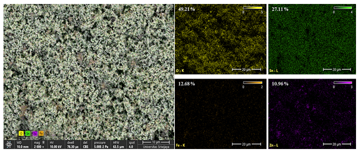 Figure 3 illustrates the morphology of ZnFe₂O₄ and ZnFe₂O₄/SnO₂ composites as observed through SEM investigation. The features of the ZnFe2O4/SnO2 composite showed a reduction in the size of the fibrillar structure and sporadic breakdown in the fibrillar structure into individualised fibrils, whereas the composite was embedded with SnO2. The EDS mapping results depicted in Figure 4 indicate that the composition of ZnFe₂O₄/SnO₂ comprises the elements O, Sn, Zn, and Fe. The presence of Sn signifies the successful synthesis of the ZnFe₂O₄/SnO₂ compound.