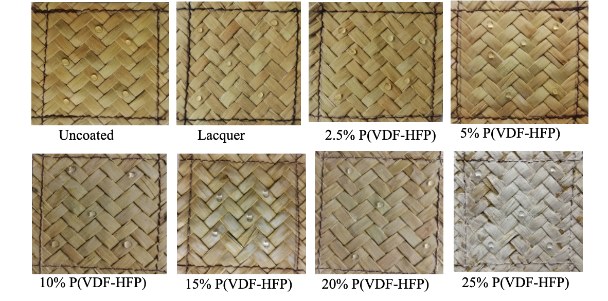 Natural fibers have gained increasing attention as eco-friendly and biodegradable alternatives to synthetic materials in the development of sustainable products. Among these, Krajood (Lepironia articulata), a wetland sedge native to Southeast Asia, is traditionally used in rural Thailand for weaving mats, bags, and home décor due to its strength, flexibility, and cultural significance [1]. However, like other lignocellulosic fibers, Krajood is highly hydrophilic and prone to degradation in humid environments. Moisture absorption promotes microbial colonization—particularly fungi—leading to discoloration, odor, and a significant reduction in mechanical integrity, thereby limiting the shelf life and broader applicability of Krajood-based products [2]. Conventional surface treatments, such as the application of natural lacquer, have been employed to improve water resistance and visual appeal. However, lacquer coatings often form brittle films that crack over time and offer only modest improvements in hydrophobicity and antifungal resistance [3-5]. Additionally, the need for non-toxic, transparent, and flexible coatings has prompted research into advanced polymer-based protective layers that can offer multifunctional performance without altering the natural aesthetics of the fiber.