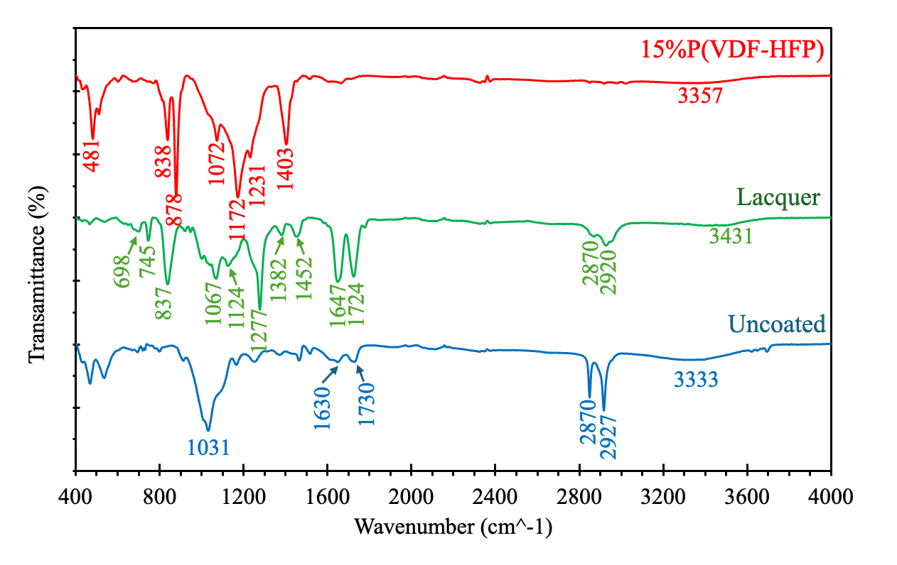 Table 1 Mechanical properties results: tensile strength, elongation at break, and Young’s modulus of Krajood products with different coatings, including uncoated sample, lacquer-coated sample, and samples coated with P(VDF-HFP) solution at varying concentrations.