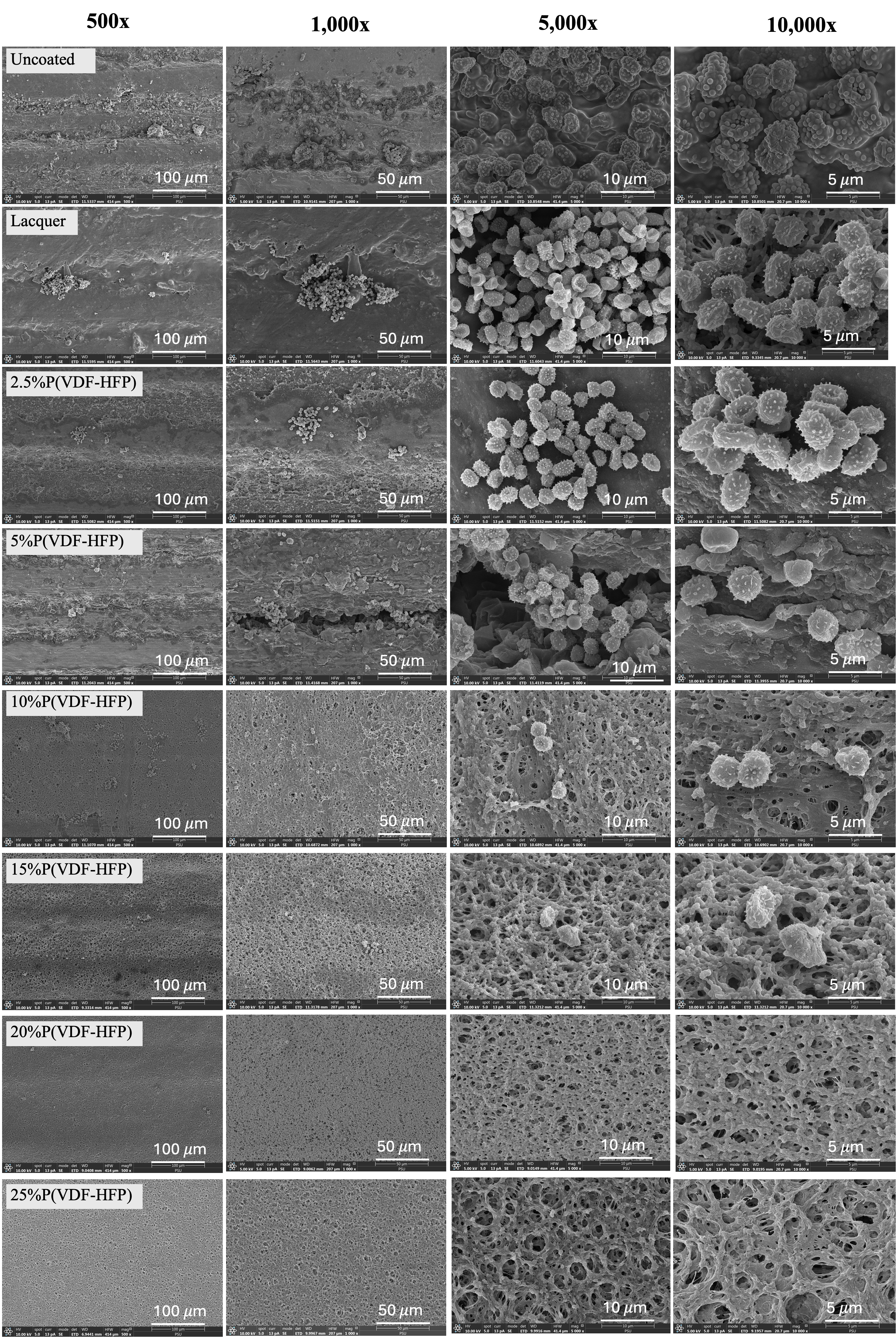 Figure 8 SEM images of Krajood products: uncoated, lacquer-coated, and coated with P(VDF-HFP) solutions at different concentrations (2.5, 5, 10, 15, 20 and 25%).