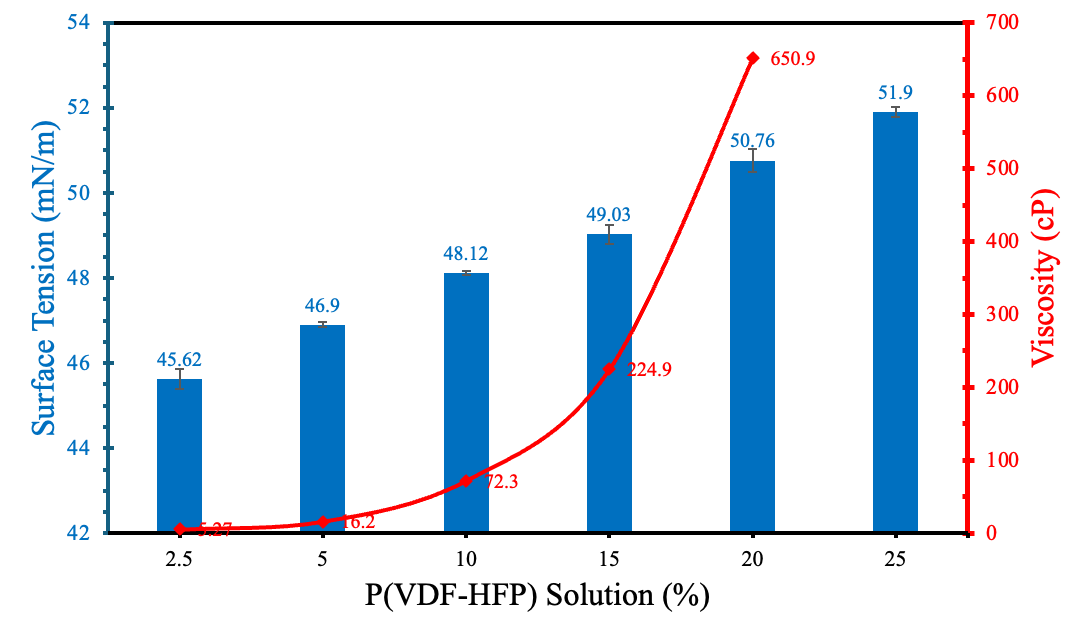 The viscosity of P(VDF-HFP) solutions demonstrates a strong dependence on polymer concentration, as depicted in Figure 2. At lower concentrations, such as 2.5 and 5.0%, the viscosity values are 5.27 and 16.2 cP, respectively, indicating relatively low resistance to flow. This can be attributed to the reduced intermolecular interactions at lower polymer densities. As the concentration increases to 10.0 and 15.0%, the viscosity rises significantly to 72.3 and 224.9 cP, respectively. This sharp increase suggests that the polymer chains interact more extensively, forming entanglements and networks within the solvent, which impede flow. At 20.0% concentration, the viscosity spikes dramatically to 650.9 cP, reflecting a near-gel-like state of the solution. This behavior is indicative of extensive molecular entanglement and strong cohesive forces within the polymer-solvent system, which substantially hinder the movement of the solution. However, at the 25.0% concentration, viscosity could not be measured (N/A), likely due to the solution's extreme thickness or gelation, which prevents accurate flow measurements using standard viscometry techniques. These findings highlight the critical role of concentration in determining the processing characteristics of P(VDF-HFP) coatings. Low-viscosity solutions (e.g., 2.5 - 5.0%) are ideal for achieving thin, uniform coatings, while high-viscosity solutions (10.0 - 20.0%) may provide thicker, more robust layers. However, overly high viscosities, as observed at 25.0%, can hinder coating uniformity and processability, underscoring the importance of optimizing concentration to balance application ease and coating performance. This understanding is crucial for tailoring P(VDF-HFP) solutions to specific coating requirements, ensuring both functionality and efficiency in application processes.