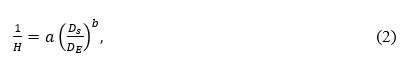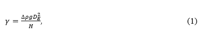 where γ represents the surface tension (N/m), Δρ is the density difference between the liquid and air, g is gravitational acceleration, DE is the droplet’s maximum diameter, and 1/H is the geometric correction factor. The correction factor 1/H is further defined as [19]: