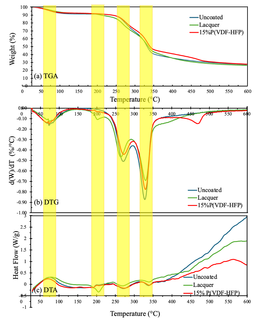 Thermal analysis is a branch of materials science that examines the properties of materials, such as Krajood coated with lacquer and P(VDF-HFP) polymer, as they change with temperature. Thermogravimetric analysis (TGA), derivative thermogravimetry (DTG), and differential thermal analysis (DTA) were performed using a simultaneous DTATGA thermal analyzer apparatus (Thermogravimetric Analyzer, METTLER TOLEDO, Switzerland) equipped with a platinum pan. Measurements were conducted over a temperature range of 25.0 to 600.0 °C, with a heating rate of 10.0 °C/min, under a nitrogen atmosphere at a flow rate of 20.0 mL/min.