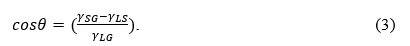 The water contact angle (WCA) serves as a key indicator of surface wettability, revealing the extent of interaction between a liquid and a surface. Hydrophilic surfaces promote droplet spreading and flattening, while hydrophobic surfaces maintain a spherical droplet shape, highlighting the varying levels of adhesion between the liquid and the surface. According to Young’s equation, this relationship is expressed as [20]: