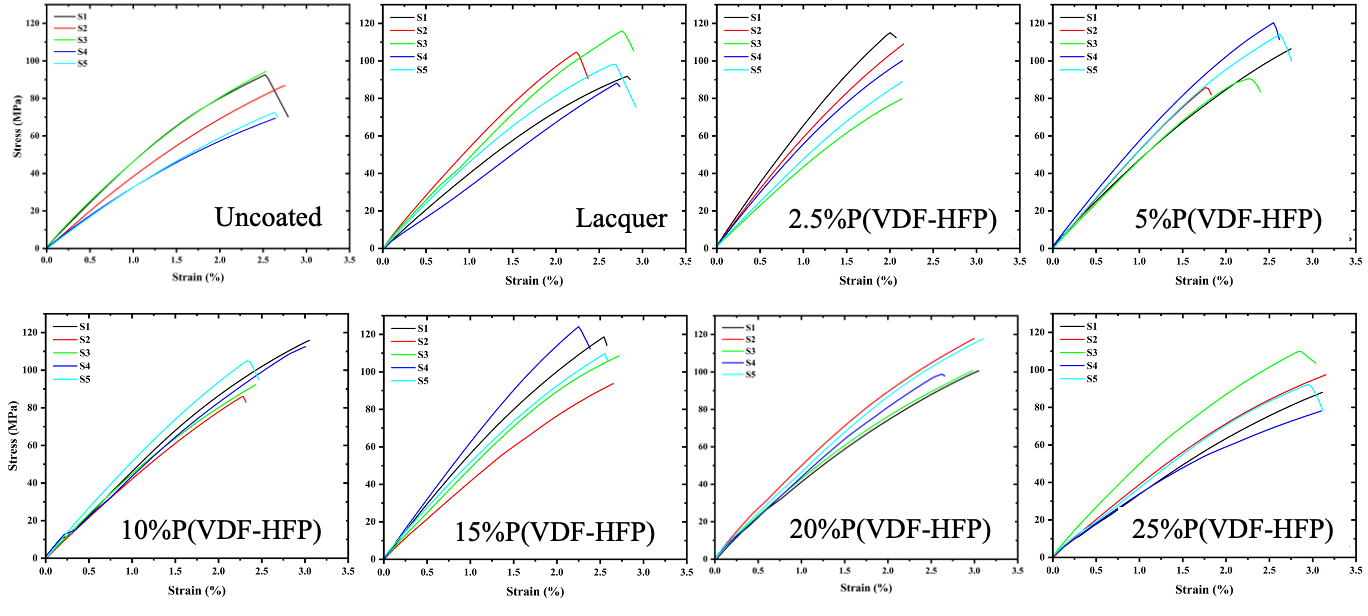 Figure 5 Stress-strain curves of Krajood samples: Uncoated, lacquer-coated, and coated with P(VDF-HFP) solutions at different concentrations (2.5, 5, 10, 15, 20 and 25 %).