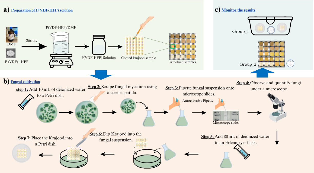 Figure 1 (a) Preparation of P(VDF-HFP) solution and coating onto Krajood samples, (b) fungal cultivation steps including suspension preparation, spore quantification, and sample inoculation and (c) storage setup for monitoring fungal growth under 2 conditions over 30 days.
