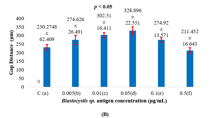Cell migration measurements were carried out via the scratch wound healing assay method. This method was carried out by making scratches manually on a cell monolayer via 100 µL sterile pipette tip perpendicularly via a plate lid that had been wiped with alcohol tissue on all plates growing on cells exposed to Blastocystis sp. supplemented with fetal bovine serum. The direction of the scratch and pressure applied must be the same for each well. The cells were washed with Phosphate Buffer Saline (PBS) until the scratched part had no attached cells and no floating cells. To minimize the limitations of manual scratching, a consistent technique in making wounds and 5 replications were applied. To minimize subjectivity, researchers used the same microscope (Zess Axiovert 40C), the same magnification, the same camera and the same settings for 5 fields of view.