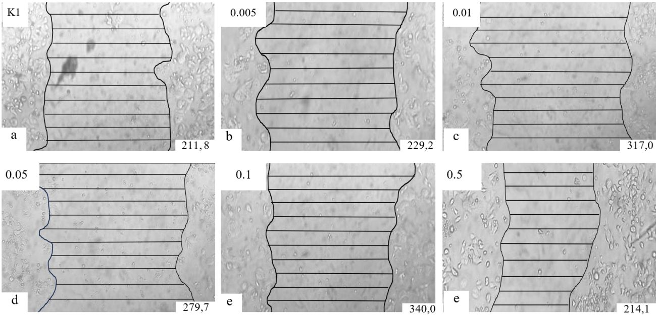 Cell migration measurements were carried out by measuring the gap distance line (manual drawing) between opposite cells from an image of the object under a microscope within 72 h. The migration distance obtained was processed with the help of ImageJ software. Cell migration assessed by the average of 10 gap distance lines between opposite cells [24,25].