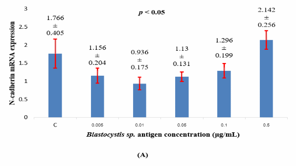 In conclusion, this study revealed that mixed subtypes 1 and 3 Blastocystis sp. could increase N-cadherin expression and the migration of HT-29 cells at high concentration. The results revealed a correlation between N-cadherin expression and cell migration. These findings indicate that Blastocystis sp. can promote cancer progression by increasing migration ability of colorectal cancer cells in vitro. Moreover, further studies were recommended to investigate this phenomenon in animal studies to observe interaction between tissue, organ, intestinal microbiota to Blastocystis sp. infection and explore activated pathways. It also needs specific analysis to strengthen the hormetic effect.