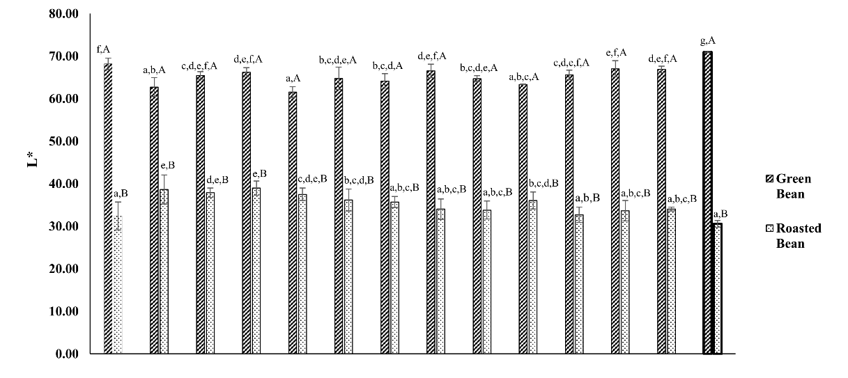 The color analysis was performed according to the method described by Yeager et al. [28] . Coffee bean color was analyzed using a Chromameter Konica Minolta CR-400 (Ramsey, NJ, USA). Coffee bean color was analyzed after grinding the beans into powder to ensure more uniform sample conditions. The color characteristics of green and roasted beans before and after acetic acid treatment were determined by the CIEL* a* b* value. The L* value represents lightness and ranges between 0 (dark) and 100 (bright). A positive or negative a* value indicates a red or green color proportion, respectively. The b* value indicates blue (−) and yellow (+) color proportions [29]. The measurements were performed in triplicate.