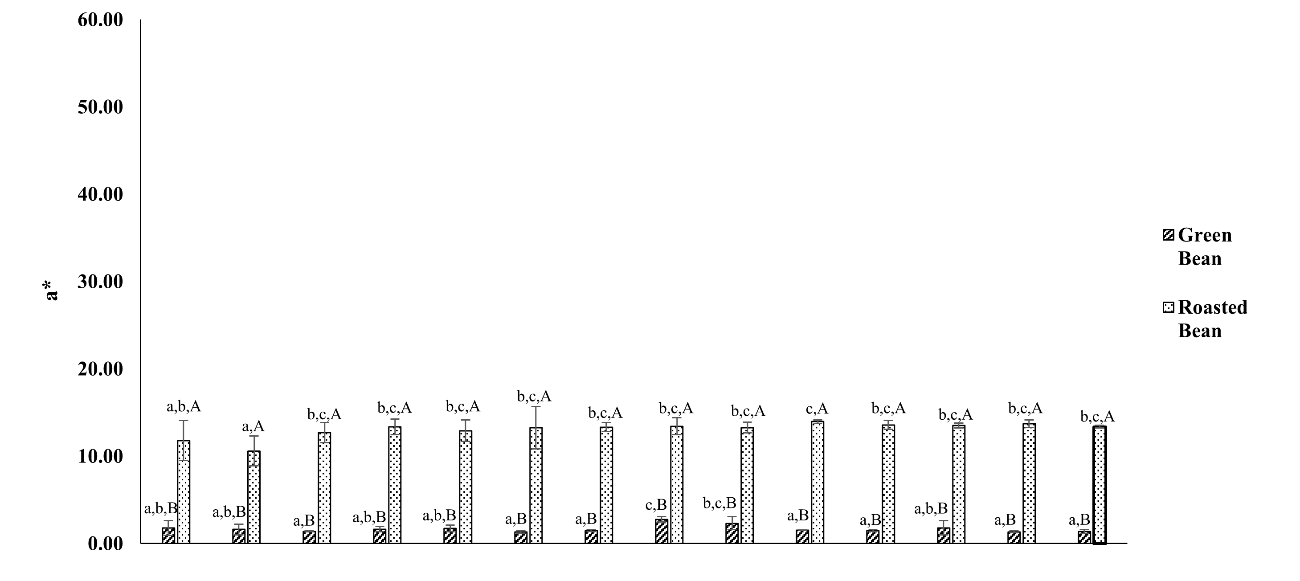 Coffee bean color is one of the most critical physical criteria for determining the coffee bean quality. The effects of acetic acid treatment on the color characteristics of green and roasted beans were investigated (Figure 1). The results showed that values of L*, a*, and b* for untreated immature and mature green coffee beans did not differ significantly, suggesting that using the green bean color parameter to differentiate between the 2 is difficult. After roasting, the L* and b* values of untreated immature roasted coffee beans were significantly greater than those of mature roasted coffee beans, indicating that the color of immature roasted coffee beans tends to be yellowish-brown or light brown. Immature roasted coffee beans with a lighter brown color indicate that the brown color did not develop properly during roasting. These coffee beans are known as quaker coffee beans.