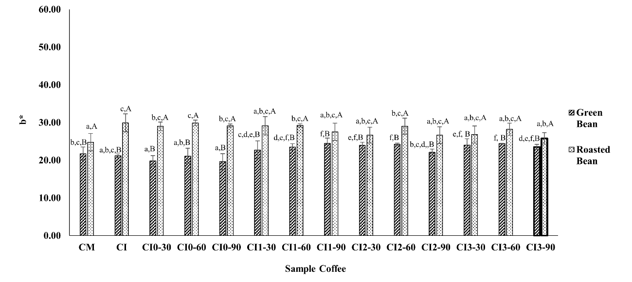 Figure 1 Color index (L, a, b) value of untreated coffee bean and acid-treated immature coffee bean. a-f Different lowercase letters on the same pattern bar indicate significant differences within each sample (p < 0.05). A-B Different uppercase letters on bar for each sample, indicate significant differences within green and roasted beans (p < 0.05). Note: CM (Coffee Mature-untreated; positive control), CI (Coffee Immature- untreated; negative control), 0 - 30 to 3 - 90 (Acetic acid concentration - treatment duration).