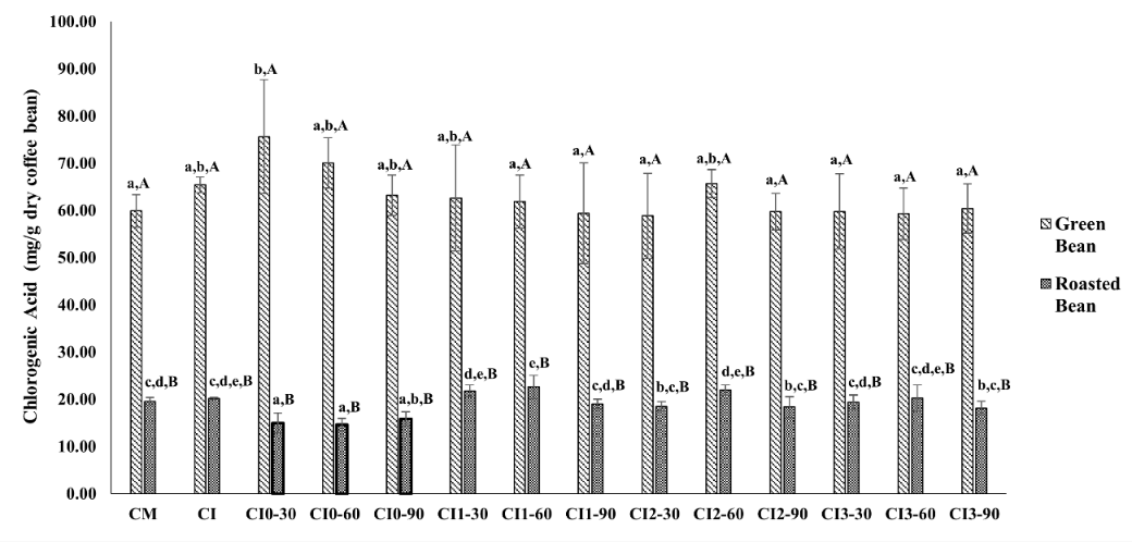 a-c Different lowercase letters on the same Colom indicate significant differences within each sample (p < 0.05). A-B Different uppercase letters on the same row indicates significant different within green and roasted bean for each sample (p < 0.05). Note: CM (Coffee Mature-positive control), CI (Coffee Immature-negative control), 0 - 30 to 3 - 90 (Acetic acid concentration - treatment duration).