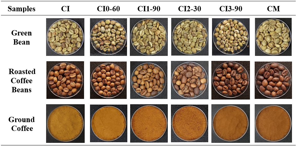 Coffee bean samples were roasted on a medium level (Agtron Scale 55) at 240 °C for 14 min using a gene cafe roaster machine (Gene Café CBR101, Ansan, Korea). The roasted coffee beans were ground using a Latina N-600 coffee grinder and sifted through a 20-mesh sieve. The ground coffee samples were stored in vacuum packaging for further analysis.