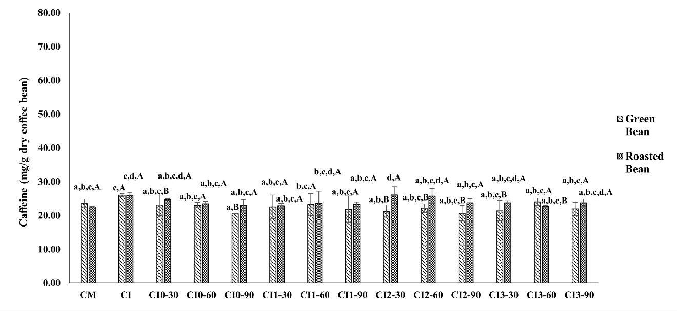 Chlorogenic acid, caffeine, and trigonelline levels were quantified using mixed external standards. These standards were prepared at concentrations of 0.5, 1.25, 2.5, 5, 7.5, 10, 12.5, 25, 50, and 75 ppm in a methanol: water (1:1, v/v) solvent mixture. The quantification was determined using the standard curve regression equation (peak area as a function of concentration) of the best curve, with a coefficient of determination (R2) ≥ 0.99. The limits of detection (LOD) of chlorogenic acid, caffeine, and trigonelline compounds were 2.02, 0.69, and 1.7 ppm, respectively. The limit of quantification (LOQ) of the analysis of chlorogenic acid, caffeine, and trigonelline compounds in this study were 6.13, 2.12, and 5.18 ppm, respectively. The measurements were performed in triplicate.