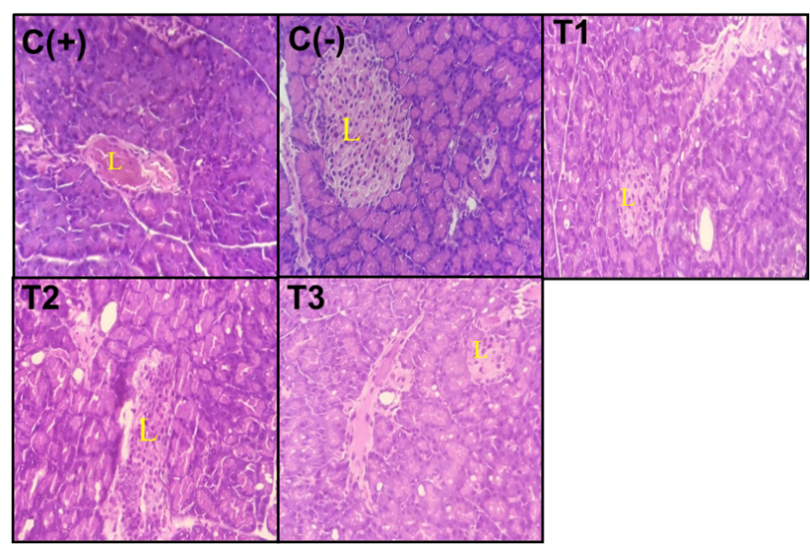 Figure 7 Histology of Pancreas. (C(–): Negative control, C(+): Diabetic control, T1: Biwa leaf nanoherbal 250 mg/kg BW, T2: Biwa leaf nanoherbal 500 mg/kg BW, T3: Glibenclamide 5 mg/kg BW). L: Langerhans islets (400×).