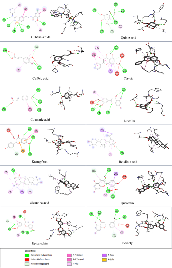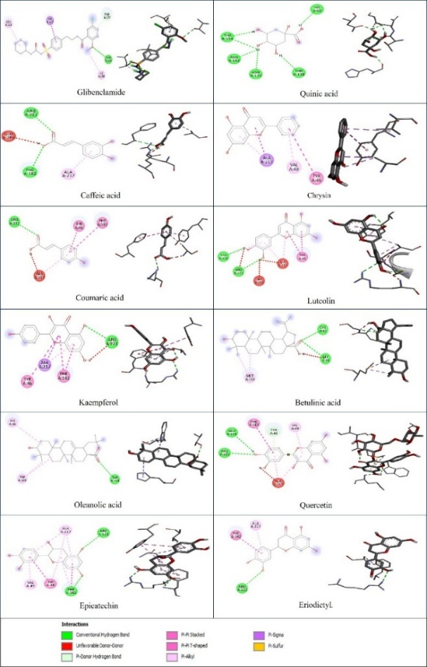 Toxicological risks were analyzed using the ProTox-III server (https://tox.charite.de/protox3/), while the PerMM tool (https://permm.phar.umich.edu/) predicted passive diffusion across lipid bilayers. These analyses provided insights into the pharmacokinetic potential and safety profile of the compounds. Molecular docking simulations were conducted to study the bioactive compounds’ interactions with specific target proteins involved in diabetes management. These include PTP1B (PDB ID:5T19), and DPP4 (4A5S) [15,23]. Ligands were prepared by downloading structural data from PubChem (http://pubchem.ncbi.nlm.nih.gov), followed by energy minimization using Open Babel within PyRx 0.0.8. Protein structures were retrieved from the Protein Data Bank (PDB; https://www.rcsb.org/), and water molecules were removed using PYMOL software. Docking simulations were performed using AutoDock Vina integrated into PyRx, with grid box dimensions optimized to target specific binding sites (Table 1). The results highlighted the optimal binding poses for each protein-ligand complex, providing valuable insights into their potential therapeutic interactions [15,24].