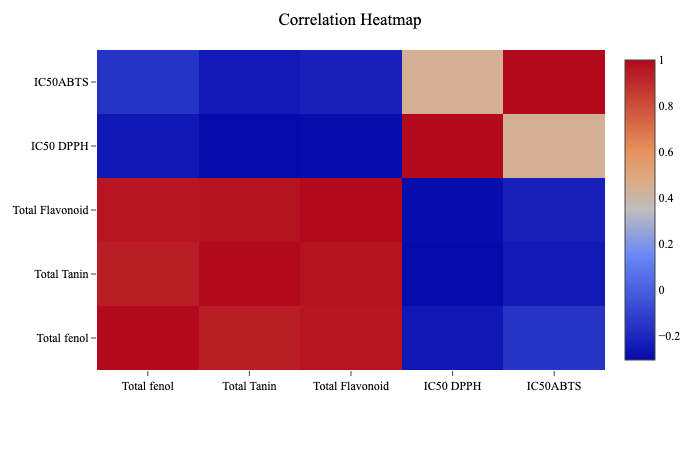 The determination of the best treatment in this study is based on several key factors, including literature review, visualization of the average test results from 5 important variables (total phenol, total flavonoid, total tannin, and antioxidant activity measured using the DPPH and ABTS methods), and correlation analysis between these variables. Based on the correlation analysis, it was found that total tannin, flavonoid, and phenol have a strong positive correlation with each other. Additionally, a significant negative correlation was observed between these 3 bioactive components and antioxidant activity, as measured by the DPPH method using IC₅₀ values. This means that the higher the content of bioactive compounds such as phenol, flavonoid, and tannin, the lower the IC50 value, indicating stronger antioxidant activity.