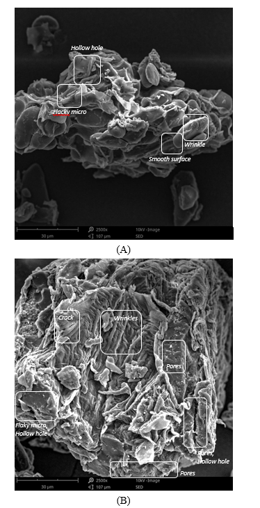 In the observation using Scanning Electron Microscope (SEM), the morphology of Z. zerumbet powder without blanching treatment (Figure 1(A)) showed a relatively intact structure with minimal cell wall damage. Flaky micro-particles were identified, which are microscopic fragments formed due to slight cell wall breakage. These particles may have resulted from structural changes during the drying process of the rhizome, leading to cracking or detachment of cell wall components. Additionally, ridges or protrusions on the cell walls were observed, indicating that the structural integrity of the material remained well-preserved. The particle surfaces appeared mostly smooth, suggesting that the powder of the rhizome without blanching pretreatment did not undergo significant deformation, causing bioactive components to remain trapped within the intact cellular structure, thus slowing their release.