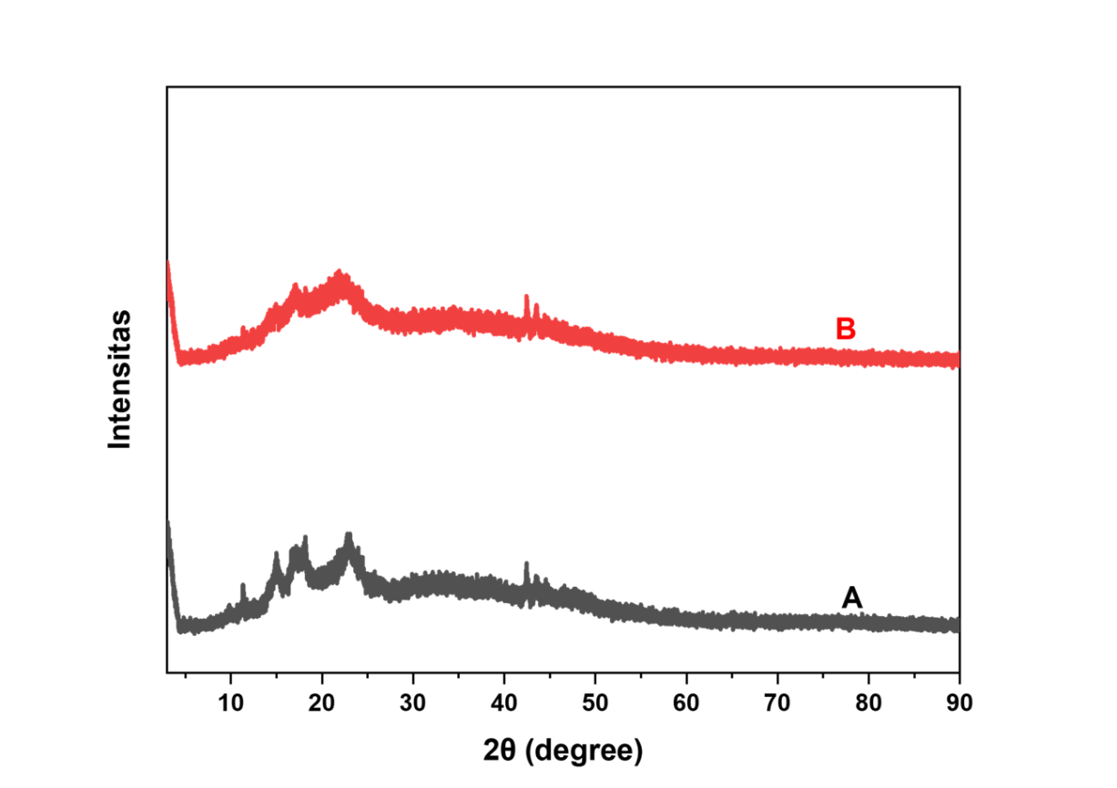 In this X-ray Diffraction (XRD) diffractogram, the diffraction patterns show significant differences between non blanching Z. zerumbet powder (A) and powder that has undergone blanching with 0.05 % citric acid solution (B). The non blanching sample exhibits several sharp diffraction peaks, indicating a higher degree of crystallinity. This crystallinity is often associated with a more ordered and tightly packed structure, which can limit the solubility of bioactive compounds.
