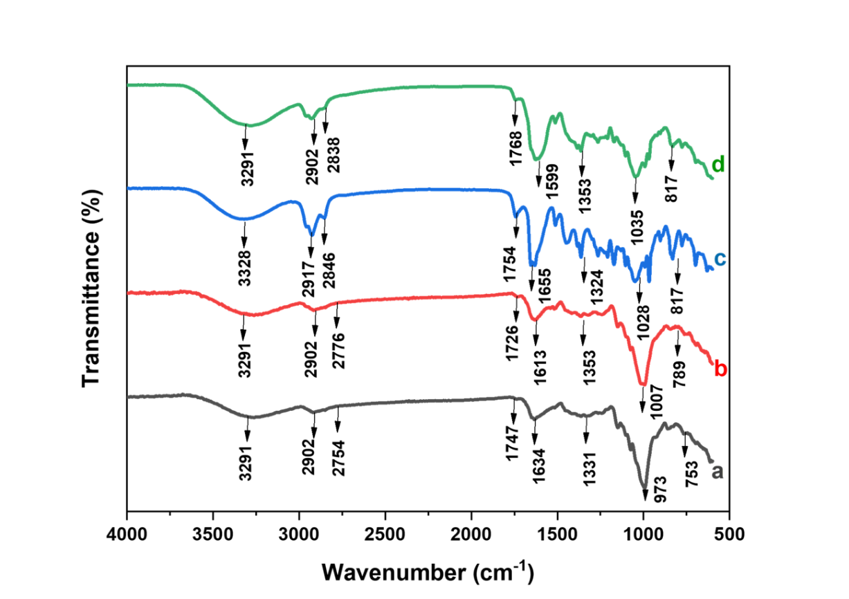 In the FTIR spectrum analysis of Z. zerumbet samples, functional group changes are clearly observed based on the peak positions and intensity variations following different treatments: Powder of rhizome from non blanching treatment (a), powder of rhizome after blanching with 0.05 % citric acid solution (b), macerated extract of powder of rhizome after blanching with 0.05 % citric acid solution (c), and sonicated extract of powder of rhizome after blanching with 0.05 % citric acid solution (d).