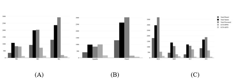 Note: (A) Pretreatment (NB: Non Blanching, BO: Blanching, BA: Blanching with citric acid 0,05 % solution), (B) Solvent (Ethanol and distilled water), (C) Extraction Method (M24: Maceration 24 h, M48: Maceration 48 h, S15: Sonication 15 min, S30: Sonication 30 min)