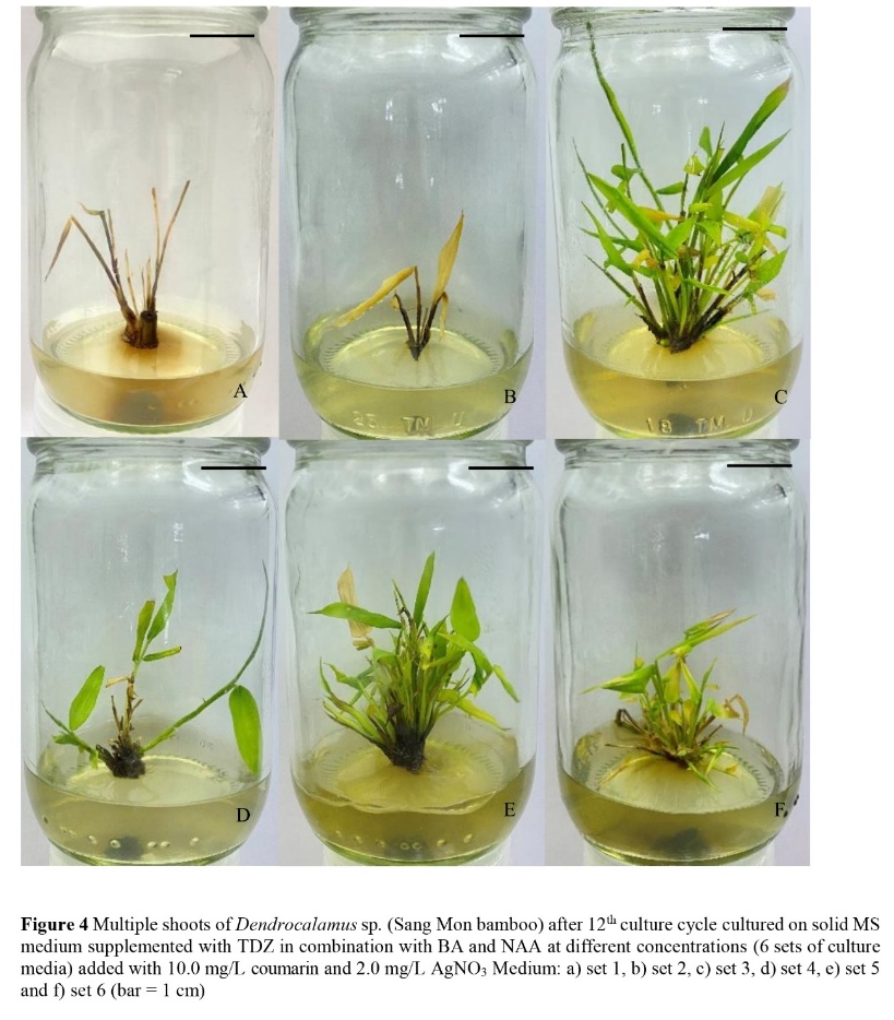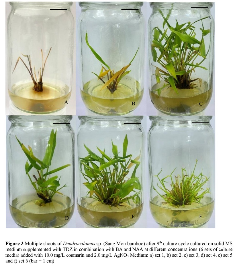 Figure 5 Multiple shoots of Dendrocalamus sp. (Sang Mon bamboo) after 3rd culture cycle cultured on solid MS medium supplemented with TDZ in combination with BA and NAA at different concentrations (6 sets of culture media) added with 10.0 mg/L coumarin and 2.0 mg/L AgNO3 Medium: a) set 1, b) set 2, c) set 3, d) set 4, e) set 5 and f) set 6 (bar = 1 cm).