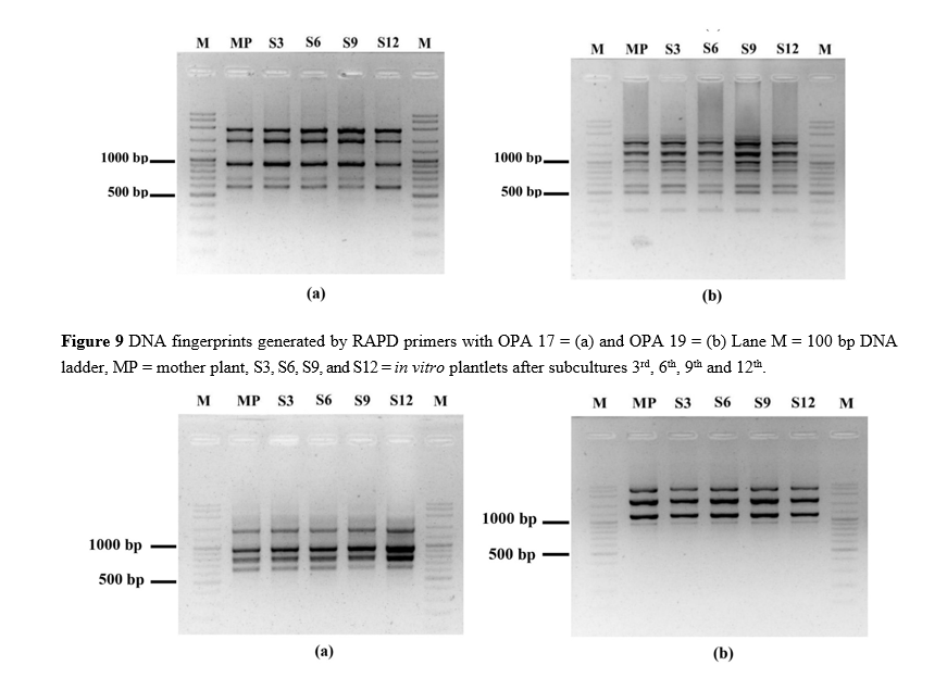 Figure 10 DNA fingerprints generated by SCoT primers with SCoT 19 = (a) and SCoT 27 (b) Lane M = 100 bp DNA ladder, MP = mother plant, S3, S6, S9, and S12 = in vitro plantlets after subcultures 3rd, 6th, 9th and 12th.
