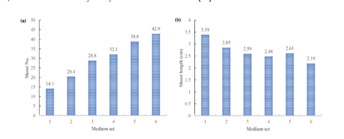 Shoot multiplication on MS medium containing TDZ combined with BA and NAA significantly increased the number of shoots compared to BA alone, as BA concentration positively influenced shoot induction. However, high concentrations of BA affect shoot height, resulting in dwarf shoots due to programmed cell death (PCD) caused by inhibiting cell division and reducing cell proliferation [51], as has been reported in Dendrocalamus sinicus [15].