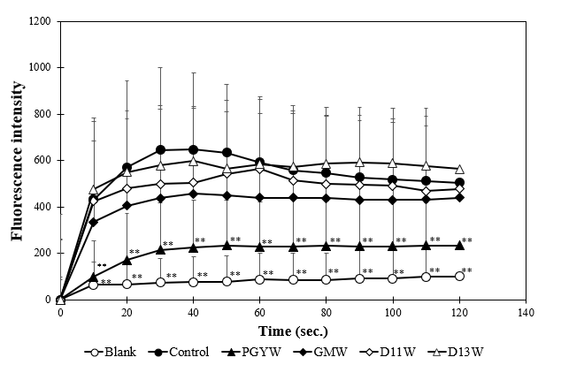 PGYW suppressed the levels of [Ca2+]i more than other samples, as shown in (Figure 3), suggesting that by inhibiting the increase of [Ca2+]i, PGYW would reduce degranulation. GMW suppressed the β-hexosaminidase release in the degranulation assay. However, GMW didn’t inhibit the increase of [Ca2+]i. This finding showed that the anti-degranulation effect of GMW was not along with the increase of [Ca2+]i. Meanwhile, bacteria water extracts did not suppress the elevation of [Ca2+]i, because they do not affect degranulation induced by antigen. This finding suggested that PGYW suppresses degranulation by inhibiting the intracellular signaling pathway that increases [Ca2+]i.