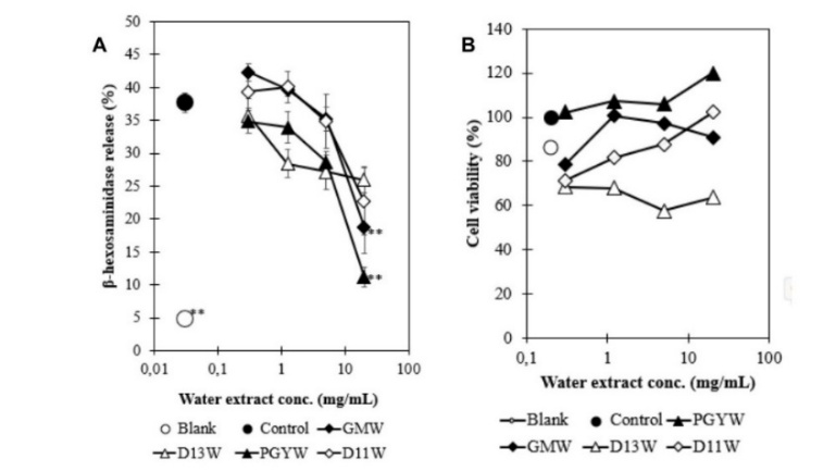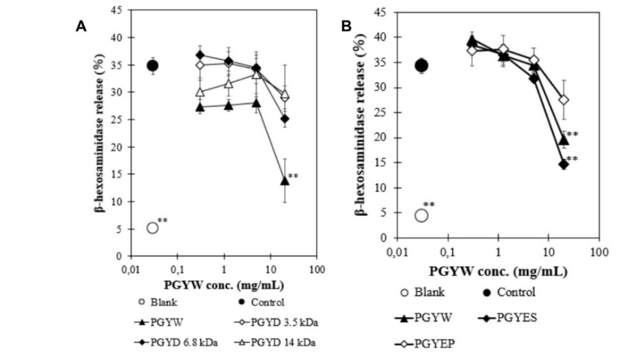 Figure 2 Degranulation activity of dialysis treatment and ethanol fractionation against RBL-2H3 cells. (A) RBL-2H3 cells sensitized to anti-DNP IgE were exposed to several dialyzes or non-dialysis yogurt (PGYW) membranes. The mean ± SD (n=3) was used to represent the data. *p < 0.05, **p < 0.01 in comparison to the control. (B) RBL-2H3 cells sensitized to anti-DNP IgE were exposed to standard yogurt (PGYW) or ethanol fractionation. The mean ± SD (n=3) was used to represent the data. *p < 0.05, **p < 0.01 in comparison to the control.