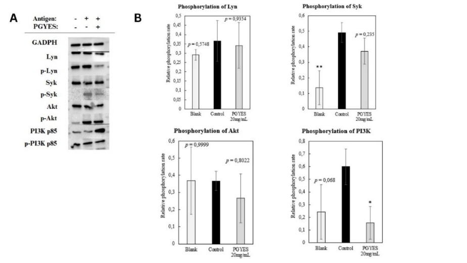 To assess the effect of the EtOH-soluble fraction of PGYW (PGYES) on the signaling pathways engaged in antigen-induced degranulation, western blotting or known as immunoblot analysis was performed. PGYES was used because had higher anti-degranulation activity than PGYW. As seen in (Figure 5), PGYES inhibited the phosphorylation of Syk and PI3K while slightly inhibiting the phosphorylation of Lyn and Akt.