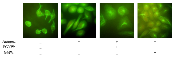 Microtubule formation is a critical step of degranulation in the calcium ion-independent pathway. As illustrated in (Figure 4), a thick and lengthy fibrous structure was elongated when the cells were activated by antigen. Meanwhile, after being stimulated with GMW and PGYW, tubulin length was shorter, and there were fewer fibrous structures in the cells than in non-stimulated cells. The shorter tubulin with fewer threads indicates inhibition of microtubule growth.