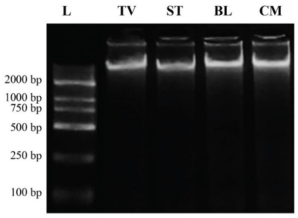 Figure 2 Total DNA after electrophoresis. (L: DL2000 DNA marker; TV: Tra Vinh; ST: Soc Trang; BL: Bac Lieu; CM: Ca Mau).