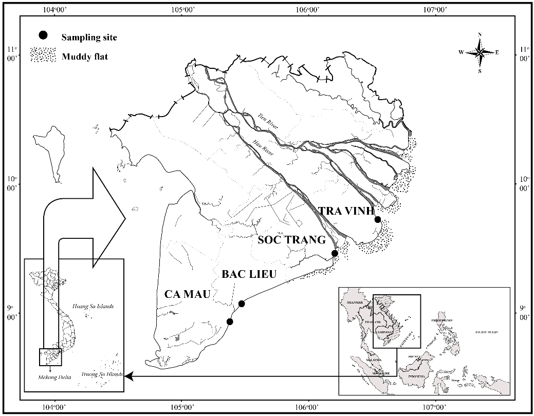 Recent studies on P. chrysospilos primarily focus on its ecological and biological characteristics, including population structure [18], reproduction [19], growth [20], burrow architecture [3], otolith structure [21], etc. These studies have elucidated the ecological significance of this species within mangrove and coastal mudflat ecosystems. Additionally, some research has addressed its tolerance to extreme environmental conditions, such as hypoxic mudflats and high temperatures [4,22]. However, genetic data, particularly regarding genetic diversity, remains limited for this species. In genetic studies, the cytochrome c oxidase subunit I (COI) gene has been widely applied to analyze genetic characteristics in various goby species (Gobiidae), including research on taxonomy, population structure, and geographic differentiation [17]. Nevertheless, studies focusing on P. chrysospilos are still scarce, especially concerning populations in the VMD, where environmental fluctuations may significantly influence the species’ genetic diversity. Therefore, this study aims to analyze the genetic diversity of P. chrysospilos based on COI gene sequences from 4 coastal provinces in the Mekong Delta: Tra Vinh, Soc Trang, Bac Lieu, and Ca Mau. Additionally, the research investigates genetic differentiation among these regions, thereby clarifying the environmental factors that shape the species’ genetic characteristics. This study contributes to a deeper understanding of the genetic makeup of P. chrysospilos, a species uniquely adapted to Southeast Asian mangrove ecosystems. By applying COI gene analysis, the research provides insights into population structure and genetic differentiation and expands the scientific foundation for understanding the role of environmental factors in the evolution and adaptation of this species. Furthermore, the findings enhance the genetic diversity database of the Gobiidae family, a crucial group for conservation and ecosystem management.