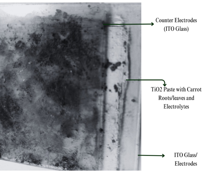 The DSSC was assembled following the schematic diagram in Figure 1. The conductive side of the ITO glass was coated with the prepared TiO2 paste and spread evenly to a thickness of 0.020 mm. The coated ITO glass was annealed on a hot plate at 500 °C for 1 h and cooled to room temperature. The annealed plate was immersed in carrot extract (roots or leaves) for 24 h to enable dye adsorption.