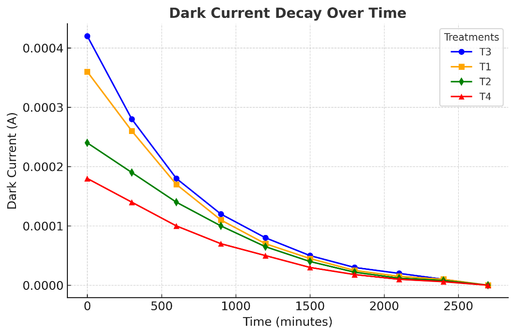 The dark current in Table 3 with time for the 4 treatments (T1, T2, T3 and T4) presents the degradation and recombination characteristics of the solar cells under dark conditions. The performance and stability of DSSCs were evaluated based on dark current (Idark) over time. Treatment 1, with DES as the electrolyte and carrot leaves as the photosensitizer, showed moderate stability with slow degradation in Idark. Carotenoids in carrot leaves were responsible for light absorption and electron transfer, whereas chlorophylls were less efficient. Meanwhile, Treatment 2, with KI/I2 electrolyte and carrot leaves, showed drastic degradation in performance because of the instability of the electrolyte, which resulted in greater recombination losses and lower efficiency.