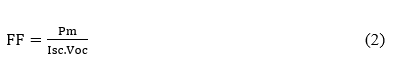 The Pm (maximum power) was calculated from the Vm (maximum voltage) and Im (maximum current). Furthermore, the efficiency of the solar cells was computed using the formula: