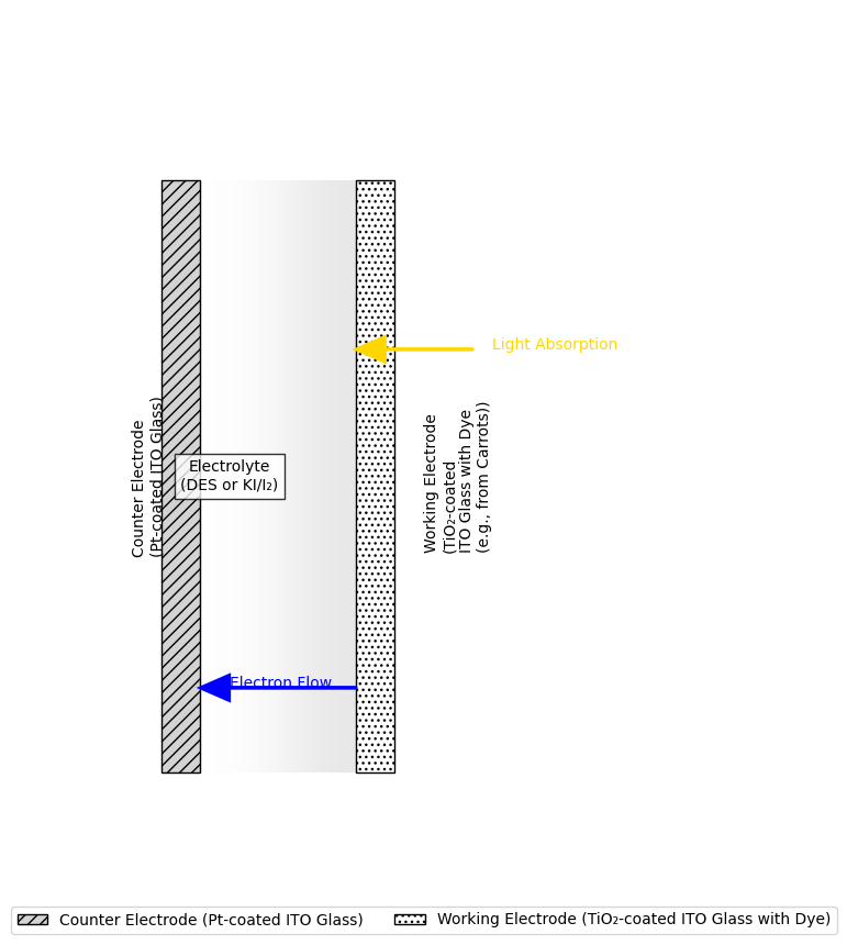 This work investigates the efficiency of dye-sensitized solar cells (DSSCs) with natural dyes from carrots as photosensitizers combined with deep eutectic solvent (DES) and KI/I2 electrolytes. As conventional DSSCs are characterized by low efficiency, instability, and environmental degradation due to the employment of synthetic dyes and aggressive electrolytes, this work explores the use of carrot-derived pigments and DES-based electrolytes as a low-cost, sustainable, and environmentally friendly alternative. By determining the efficiency of the materials as DSSCs, this work will contribute to the development of renewable energy technologies and the emergence of more viable DSSCs.