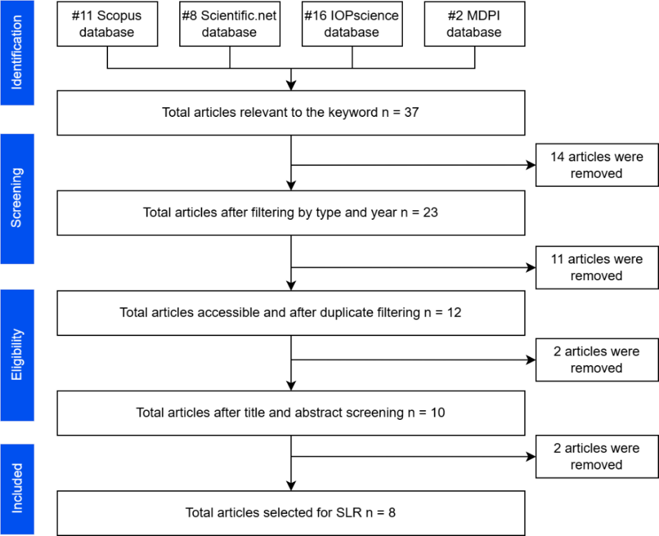 The databases used in the literature search were Scopus, Scientific.net, IOPscience, and MDPI, with the following search keywords: “polydimethylsiloxane” AND “vitreous” AND “substitute.” Our search was limited to articles published in international journals in the last ten years written in English and accessible. Database, keywords, total articles obtained from the database, and article types are shown in Table 1.