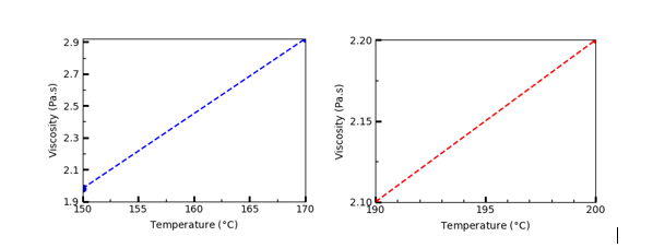 In addition to KOH concentration, temperature, reaction time, and D4 purity can affect viscosity. The research samples conducted by Setiadji et al. [32] (S16 and S17) and Waslaludin et al. [35] (S9 and S10) showed that the higher the temperature used, the increased viscosity. This is because temperature can affect molecular weight distribution. Temperature plays a crucial role in chemical bond formation and breaking energy dynamics. Higher temperatures provide more energy to overcome activation barriers, facilitating the formation of new bonds during polymerization. However, they can also lead to the breaking of existing bonds, which can affect the overall molecular structure [40]. The viscosity vs temperature graphs of samples S9 - S10 and S16 - S17 are shown in Figure 5. Therefore, paying attention to temperature parameters is necessary to obtain PDMS with the desired viscosity. Generally, a longer reaction time can elongate the polymer chain if the catalyst remains active during the reaction, thus increasing the viscosity [41]. For example, samples S6 and S8 show variations in reaction time parameters. S8 has a longer reaction time than S6, which then S8 has a higher viscosity than S6 [35]. From the description of KOH molarity, temperature, and reaction time, 200 °C is the optimal temperature because using 0.53 M KOH only requires a reaction time of 50 min. The optimal reaction time is 45 - 70 min for PDMS with low, medium, and high variations.