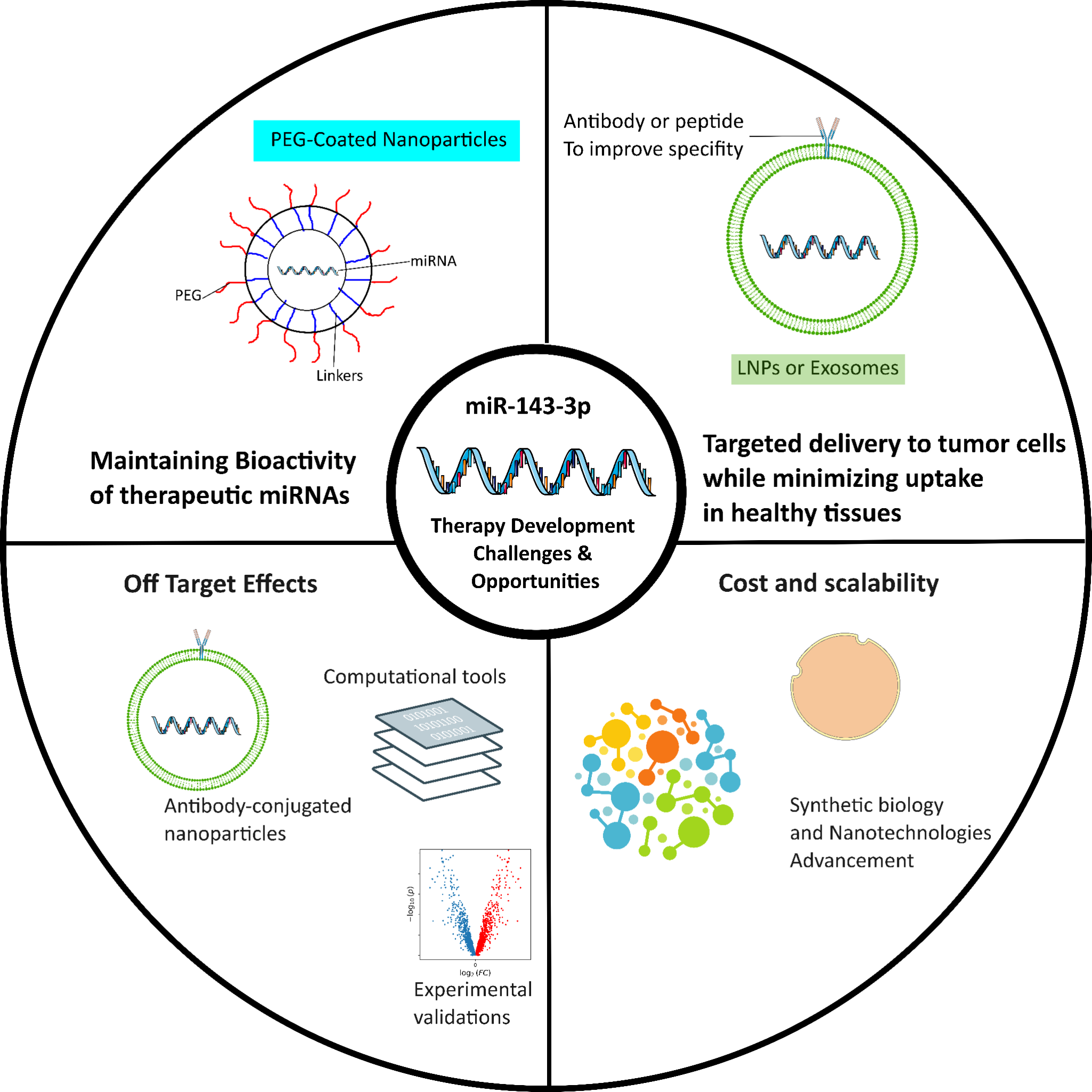 miR-143-3p represents a promising therapeutic target in breast cancer, particularly in aggressive subtypes like TNBC, due to its tumor-suppressive effects on key oncogenic pathways such as KRAS and HRAS. By inhibiting proliferation, metastasis, and therapy resistance, miR-143-3p shows the potential to improve outcomes in cancers driven by dysregulated RAS signaling. However, challenges in efficient and targeted delivery, stability, and minimizing off-target effects must be addressed for clinical translation. Advances in nanotechnology and delivery systems, including lipid nanoparticles and exosomes, offer solutions to enhance miRNA stability and specificity. Further research into miR-143-3p’s role in the tumor microenvironment and its interactions with oncogenic pathways is essential for developing effective therapies. Overall, miR-143-3p-based strategies hold significant potential to revolutionize breast cancer treatment and pave the way for personalized medicine.