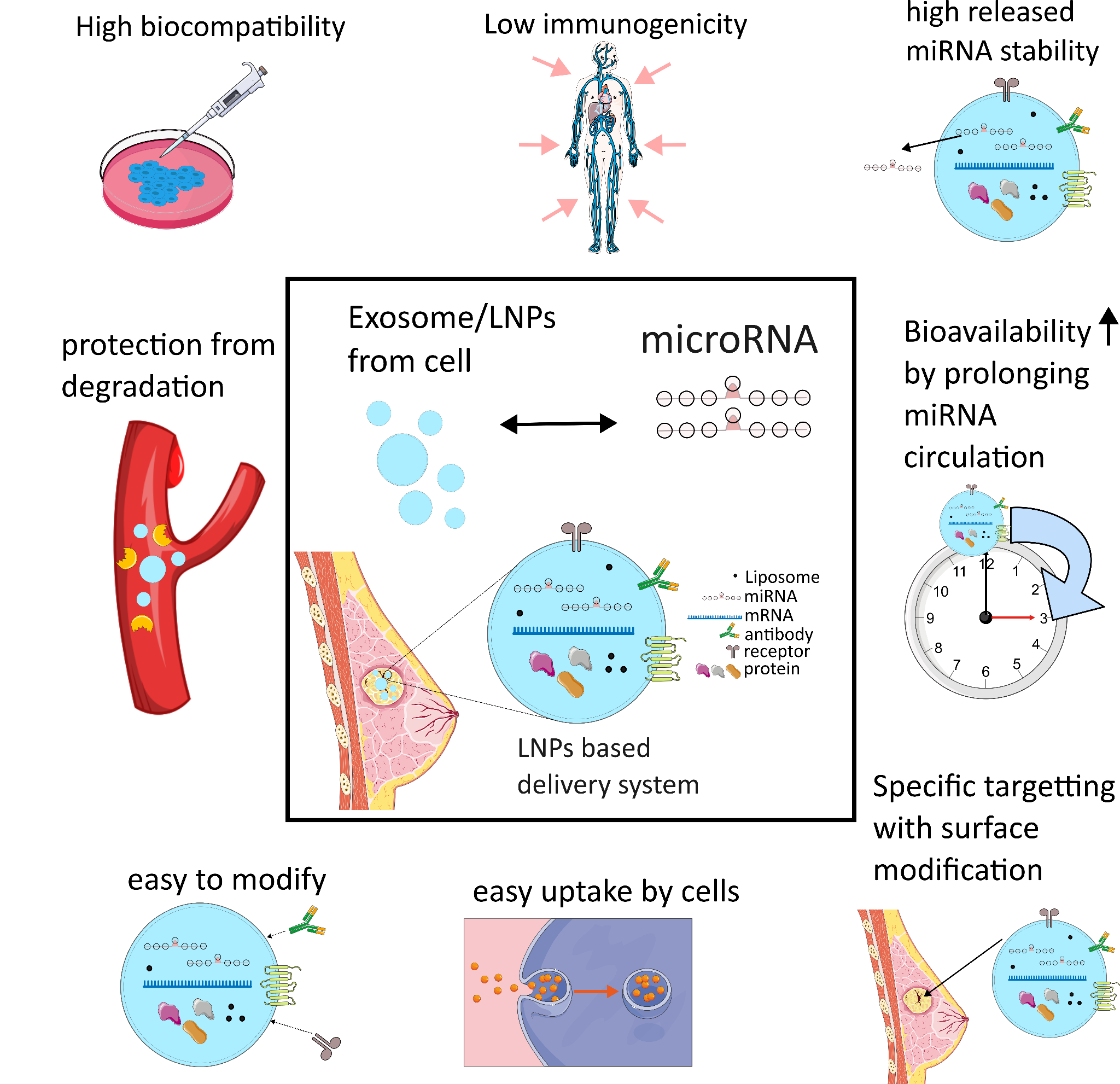 Based on in-silico and in-vitro studies, miRNA-based therapeutics using miR-143-3p have the potential to be new therapeutic agents for all breast cancer subtypes. However, the development of miRNA-based therapies still has many challenges, especially in the delivery efficiency and specificity of miR-143-3p. Chemical modifications to miRNA delivery, such as organic and inorganic nanotechnology, have been developed to increase the efficiency of miRNA delivery [90]. However, the development of a targeted delivery system for miR-143-3p in breast cancer is still limited. Thus, research on targeted delivery systems is needed to deliver miRNA to target cells directly. Targeted delivery systems can reduce the therapy dose to lower toxicity to normal cells. Therefore, further research is needed on tumor microenvironments in various breast cancer subtypes. Discoveries regarding the nature of tumor microenvironments in breast cancer allow the discovery of new targets more suitable for miRNA nanocarriers. Research on the miR-143-3p targeted delivery system that has been conducted in vitro also needs to be conducted in vivo on experimental animals since in vivo research involves more complex interaction between miRNA, its carrier, and tumor microenvironment.