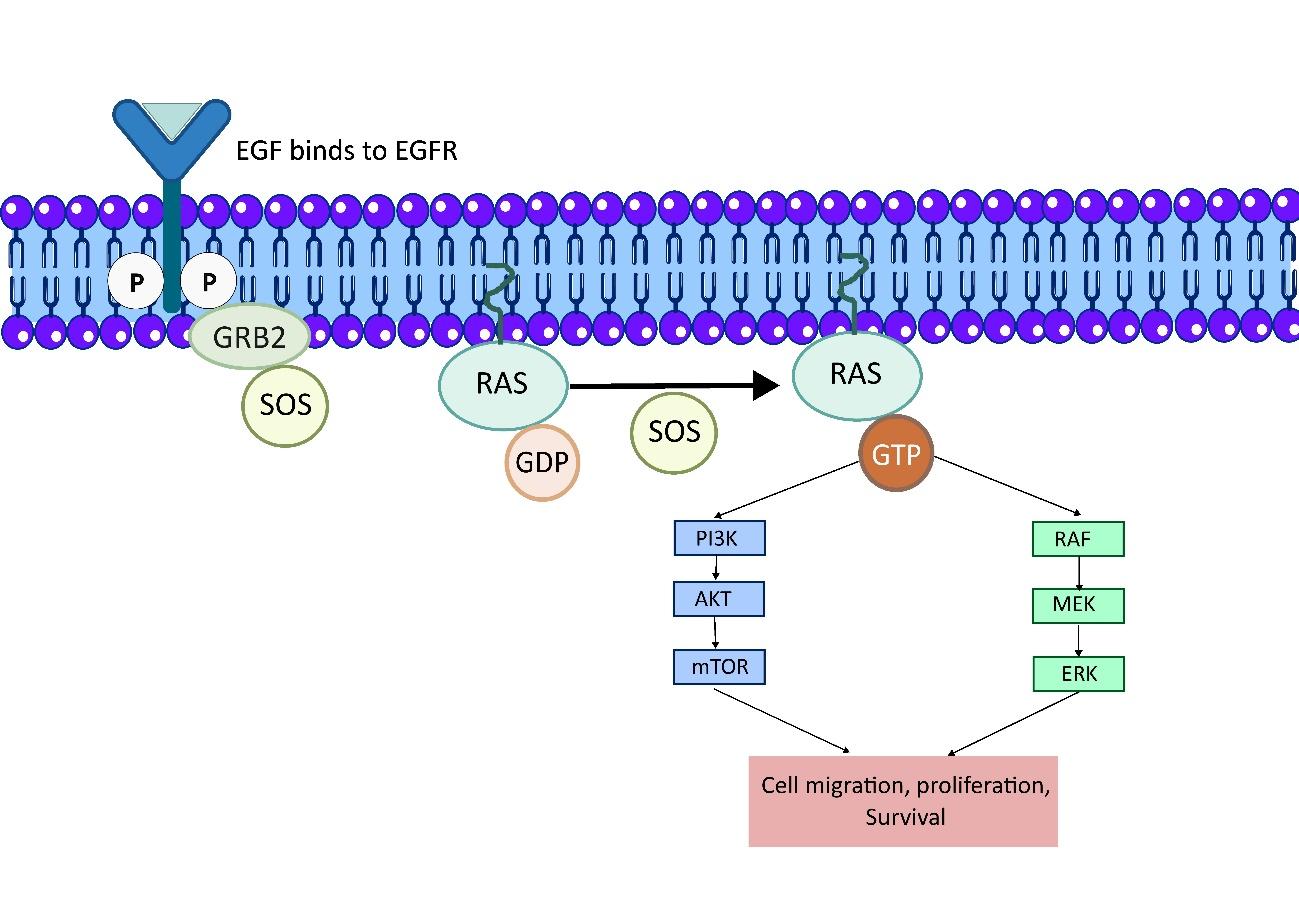 In general, the RAS protein regulates proliferation, differentiation, cell survival, and protein localization on the cell membrane, which plays a role in various signaling processes, including oncoprotein signaling [21]. In addition to increasing oncoprotein signaling, RAS also plays a role in regulating cell proliferation and apoptosis [22]. RAS protein activation occurs when epidermal growth factor (EGF) binds to tyrosine kinase receptors such as epidermal growth factor receptor (EGFR). When RAS is activated, many signals are initiated. The major signaling pathways that have been well characterized are the mitogen-activated protein kinase (MAPK) pathway via the Raf/MEK/ERK (MEK, mitogen-activated protein kinase; ERK, extracellular signal-regulated kinase) and PI3K/AKT/mTOR (PI3K, phosphatidylinositol 3-kinase; AKT, protein kinase B; mTOR, mechanistic target of rapamycin) phosphorylation cascades [23,24]. RAS activation and signaling are shown in Figure 1.