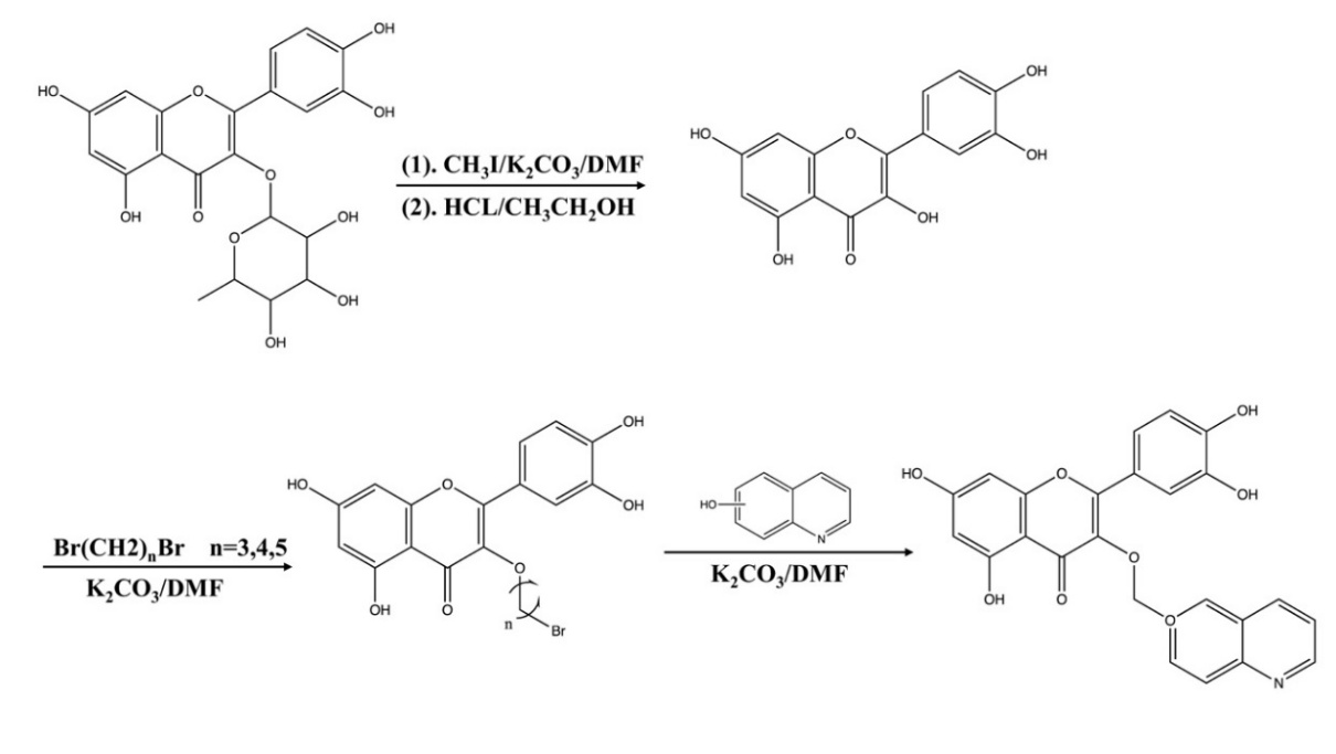 The design and synthesis of quercetin derivatives containing quinoline moieties aim to improve their anticancer properties through modifications to hydroxyl groups using specific reactions such as methyl protection and etherification. The reaction process can be seen in Figure 10. Although this process necessitates controlled reaction conditions and purification steps that may limit scalability, it is crucial for obtaining high-quality derivatives with potential therapeutic applications [19].