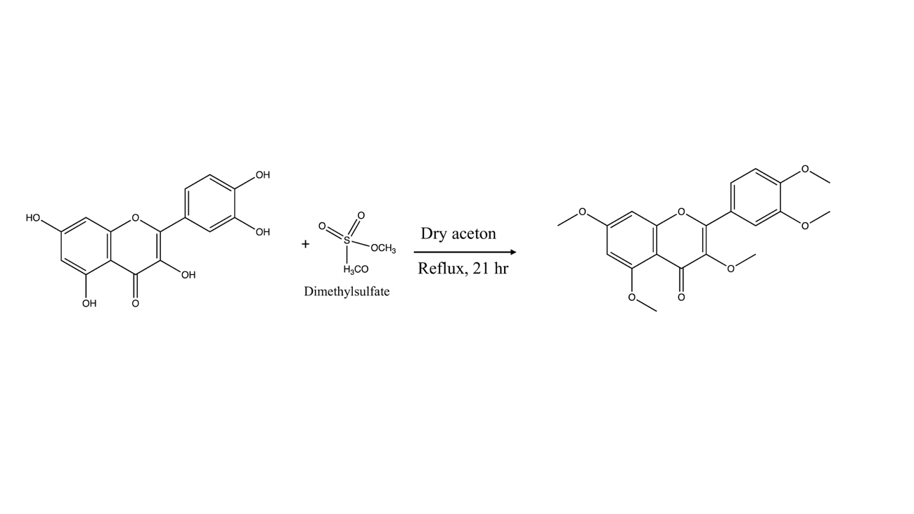 A pentamethoxy derivative of quercetin, was synthesized to improve its anticancer potential against the MDA-MB231 breast cancer cell line by enhancing stability, solubility, and bioavailability through methylation. The reaction process can be seen in Figure 5. The synthesis involved reacting quercetin with dimethyl sulfate in the presence of anhydrous potassium carbonate under reflux in acetone, followed by recrystallization to obtain a pure product. Spectral analysis confirmed successful methylation, and biological testing revealed significant antiproliferative activity, reducing cell viability by 56.3 % with an IC50 of 2.042 µM in MDA-MB231 breast cancer cell lines. However, the synthesis required precise reaction control to optimize yield, and bulky substituents potentially affected binding efficiency in docking studies, indicating a need for further testing to assess in vivo efficacy and selectivity [14].