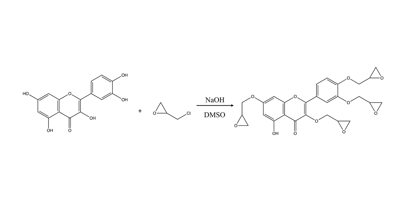 The synthesis, molecular structure, and optical properties of glycidyl derivatives of quercetin are examined in this study, which focuses on the preparation of glycidyl ethers utilizing epichlorohydrin. The reaction process can be seen in Figure 2. The research assesses the quadratic polarizabilities of these derivatives, revealing a notable divergence between experimental and theoretical values; however, a significant correlation is still observed. This relationship facilitates preliminary estimations of the nonlinear optical properties of quercetin derivatives, suggesting potential applications in the development of new polymers. Nonetheless, the study identifies steric hindrances associated with glycidation and varying spectral effects influenced by the positioning of hydroxyl groups as limitations [12].