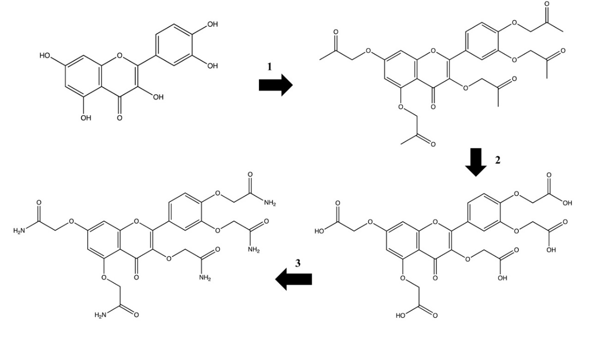 Utilizing the Williamson ether synthesis, this research creates quercetin-acetamide derivatives by modifying phenol hydroxyl groups. The multistep process, requiring precise control over reaction conditions and chromatographic purification, poses challenges. Nonetheless, the resulting derivatives are evaluated for biological activity, demonstrating notable antiproliferative effects against cancer cell lines, with enhanced cytotoxicity compared to their parent compounds. These findings suggest potential for further development in anticancer therapy [15]. The reaction process can be seen in Figure 6.