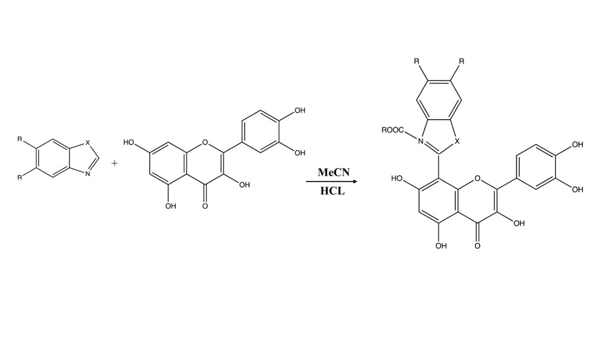 Research on quercetin hybrids focuses on their synthesis via one-pot amidoalkylation with benzazole derivatives, showcasing promising radical scavenging properties. The reaction process can be seen in Figure 8. The study optimizes conditions to achieve high yields; however, it encounters limitations concerning certain adducts and solvent effectiveness that affect product solubility and yield [17].