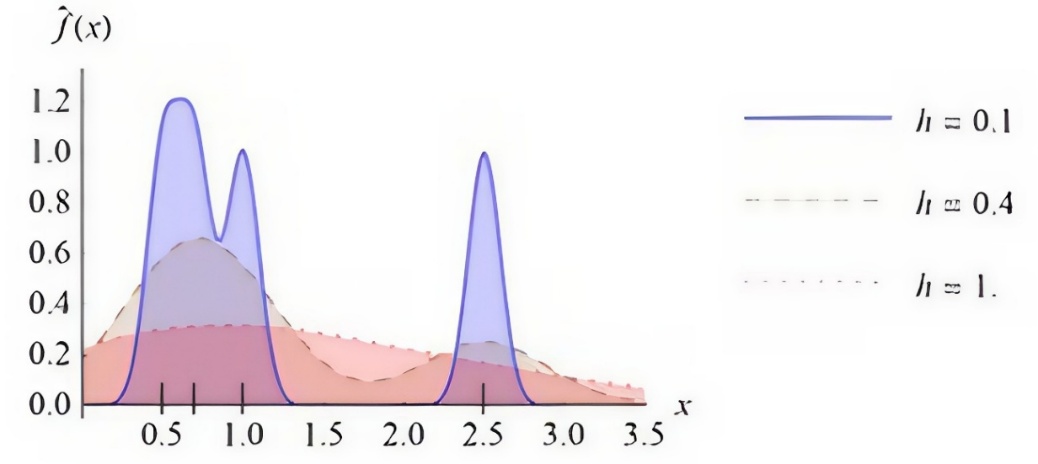 estimates. Smaller bandwidths (0.1) spread density widely, resulting